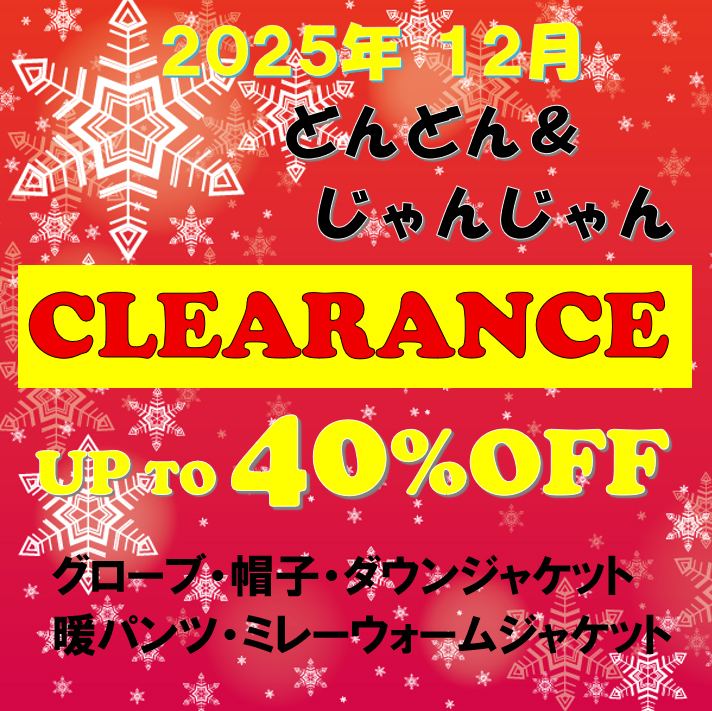 クリアランスセールで、「どんどん&じゃんじゃん」プライスダウン! お知らせ 2025.12.12 クリアランスセールで、「どんどん&じゃんじゃん」プライスダウン! 今!欲しい! グローブや帽子もクリアランス! 暖パンツもダウンジャケット! ミレーのティフォンウォームジャケット&パンツ!